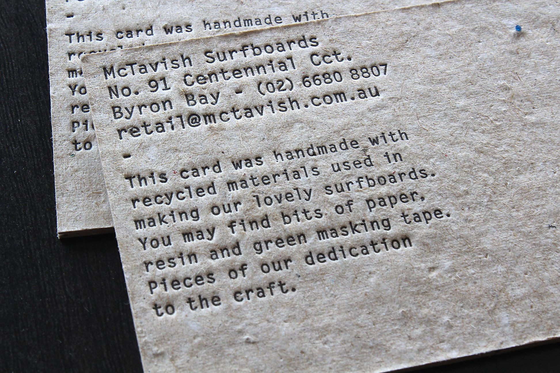 A limited edition run of business cards commissioned by the master craftsmen at McTavish surfboards in Byron Bay.