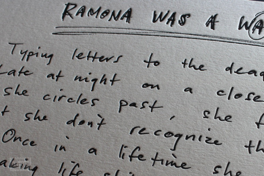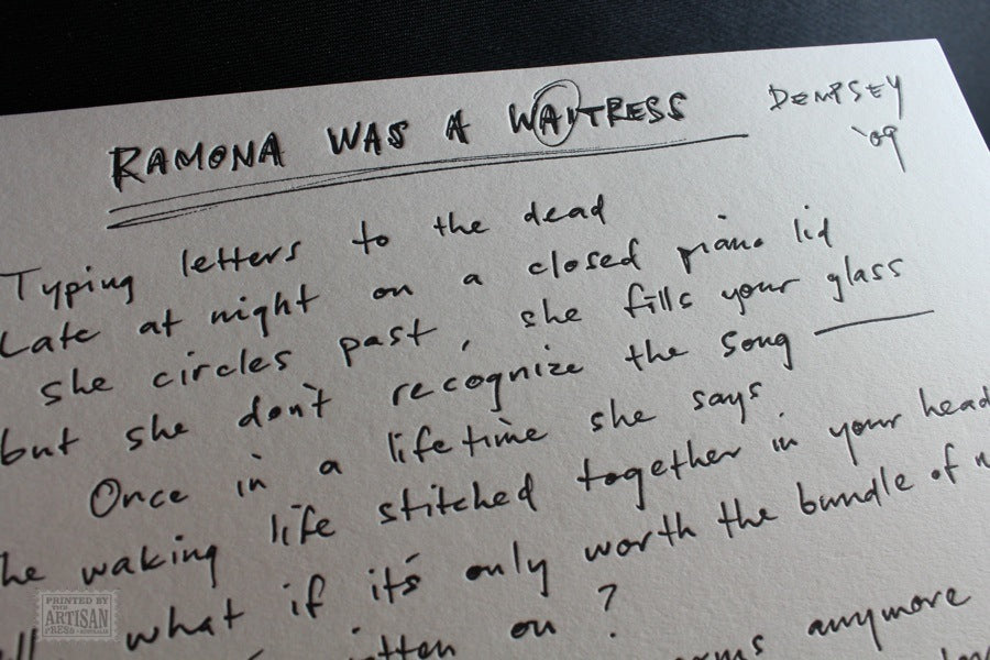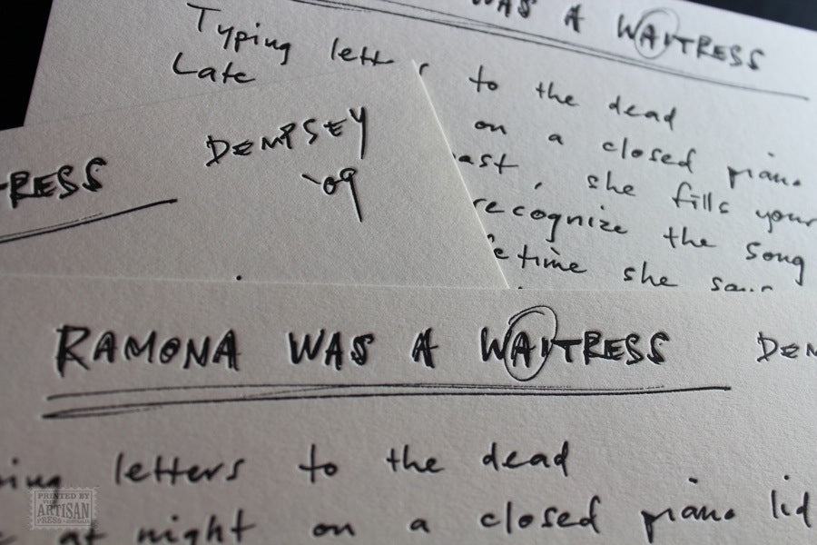 Letterpress printed in a soft black on a 1969 Heidelberg cylinder press by Wayne Davis. The cylinder press was chosen because of the thin impression strip it creates when paper carried on a round surface meets a plate on a flat surface. This results in a beautifully sharp image.
