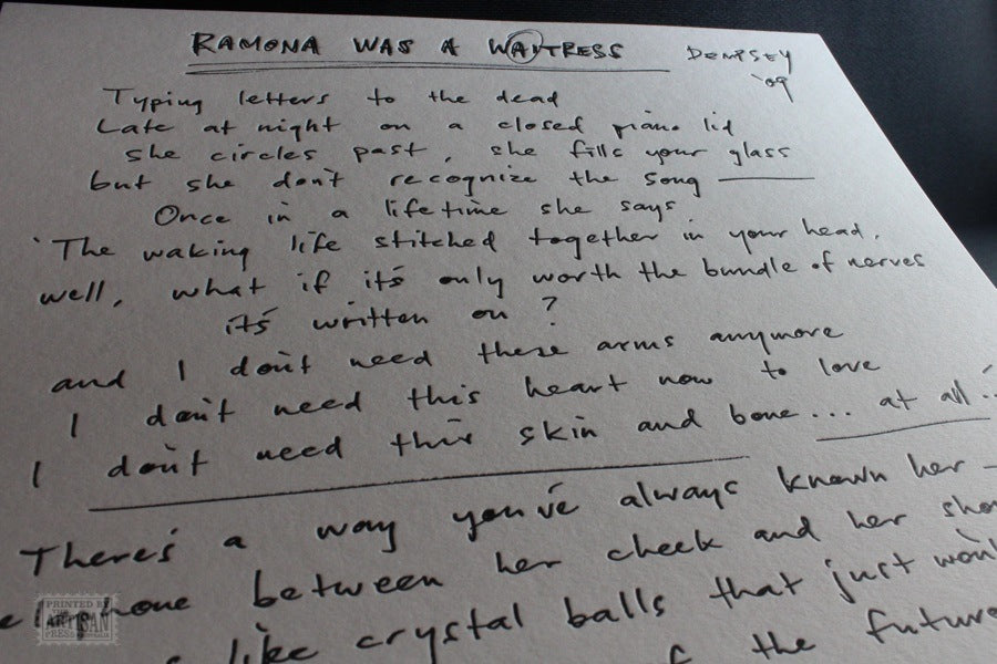 A limited edition run (120) of handwritten song lyrics commissioned by EMI Music for Australian artist Paul Dempsey (Something for Kate). The notes were to accompany the release of Dempsey's debut solo album -Everything Is True.