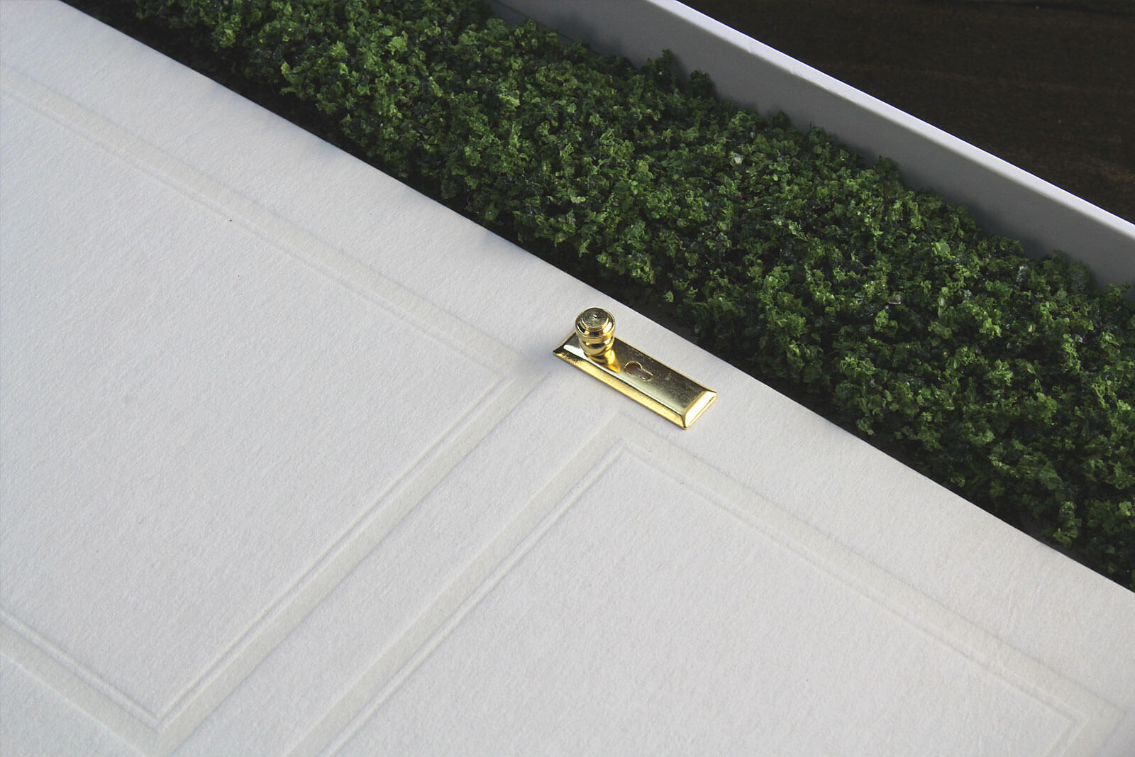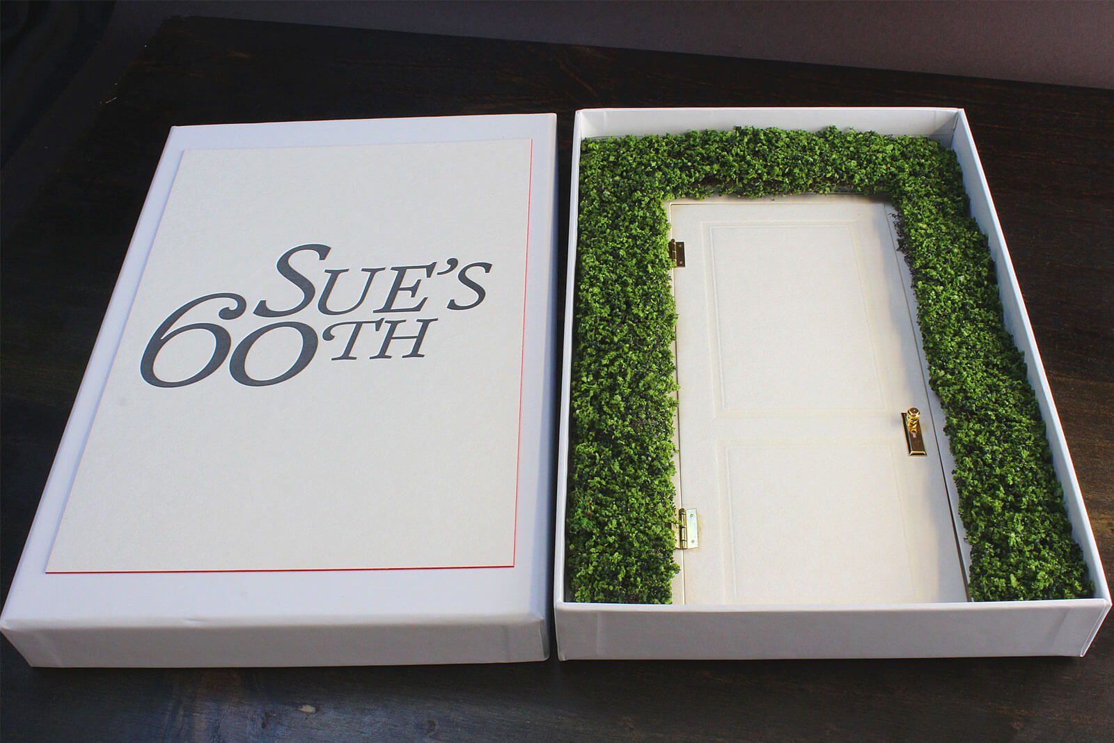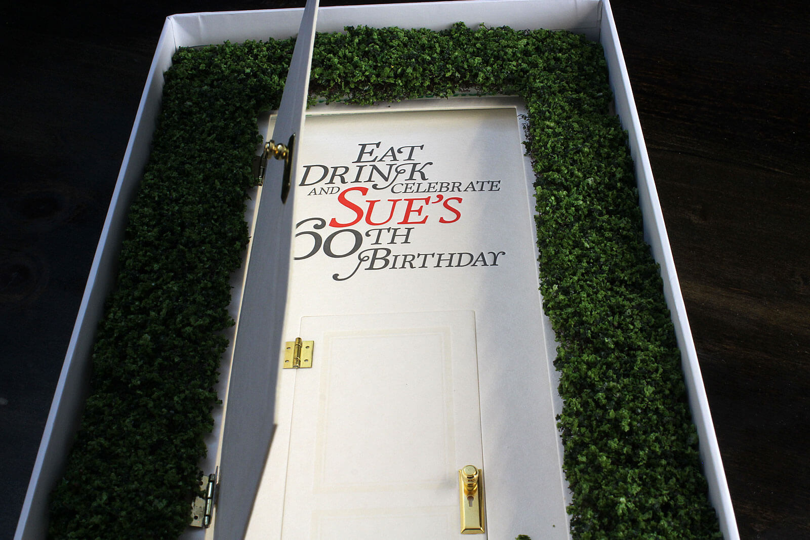 The theme was a madhatter's party and consisted of a box that opened up into series of letterpress printed doors with the event details revealed in the final door. The tiny handles, hinges and grass were all added after printing.