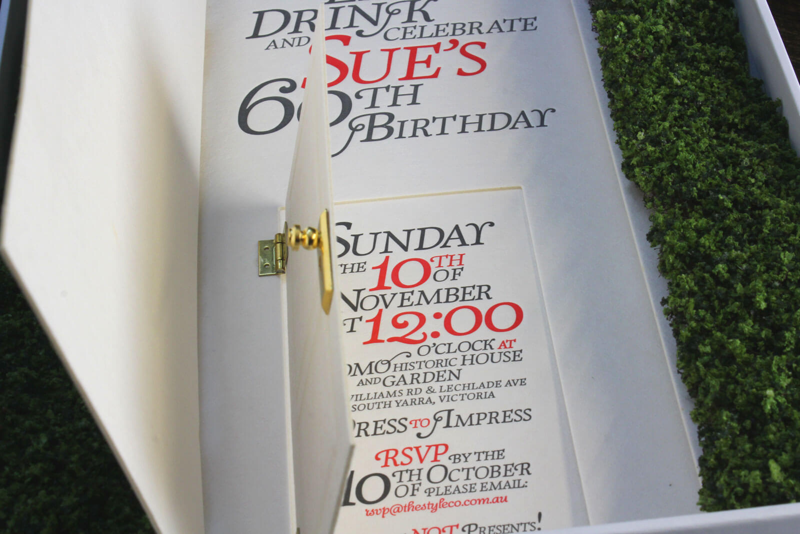 A unique letterpress birthday invitation box set commissioned and designed by the incredibly creative team at Melbourne's event planner The Style Co.